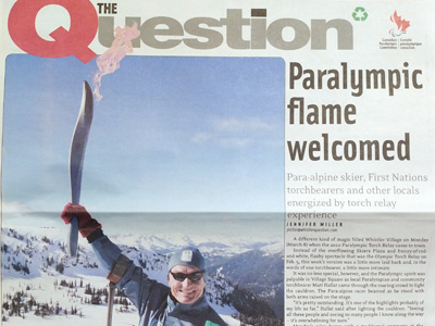 During the 2010 Winter Olympic & Paralympic games in Whistler, BC, Canada, The Question Newspaper featured a photo from Canadian Data Solutions on the cover of the March 11, 2010 publication. This photo is from the top of Whistler mountain and features the Paralympic Torch being carried by a local ski coach.
